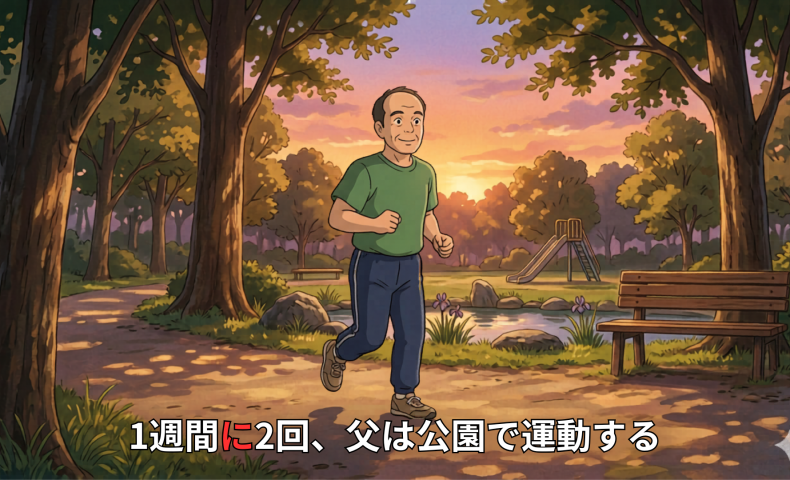 (3) 1週間に2回、父は公園で運動する / 運動します。