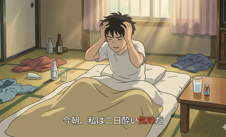 (2)けさ わたしは ふつかよいぎみだ / ふつかよいぎみです。