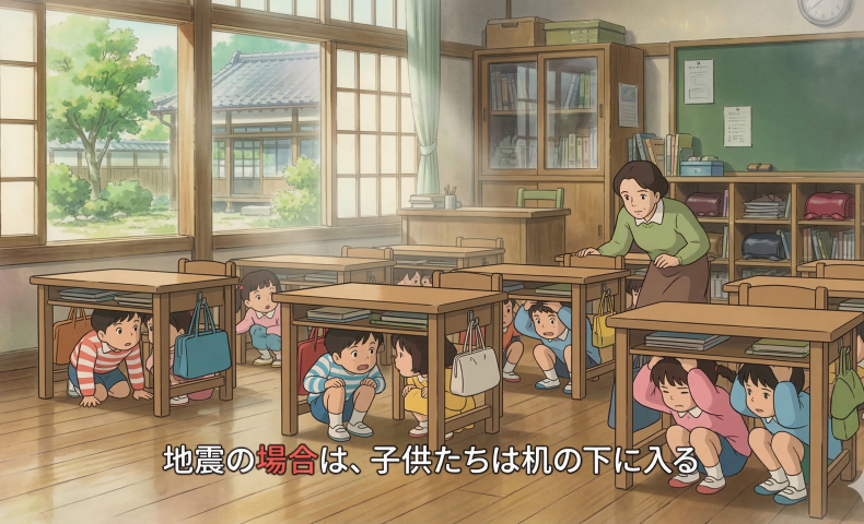 (3) Jishin no baai wa, kodomotachi wa tsukue no shita ni hairu / Hairimasu.