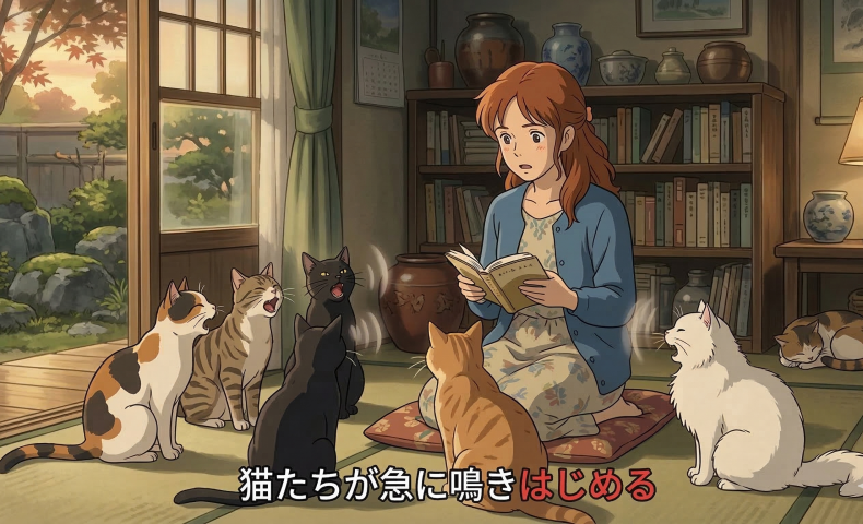 (1) 猫たちが急に鳴き始める / 鳴き始めます。