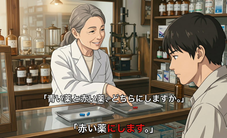 (4) 青い薬と赤い薬、どちらにしますか。赤い薬にします。