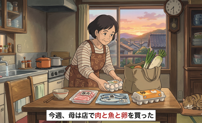 (3) 今週、母は店で肉と魚と卵を買った / 買いました。