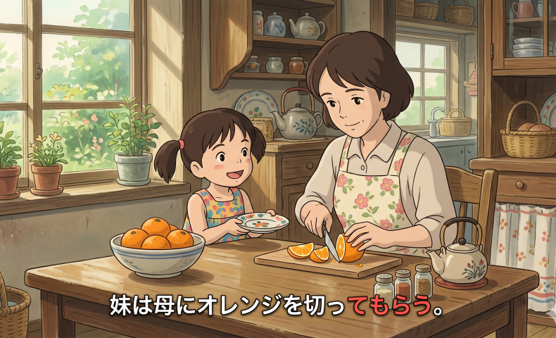 (3) 妹は母にオレンジを切ってもらう / 切ってもらいます。