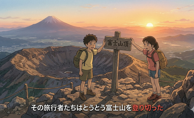 (5)その旅行者たちはとうとう富士山を登り切った / 登り切りました。