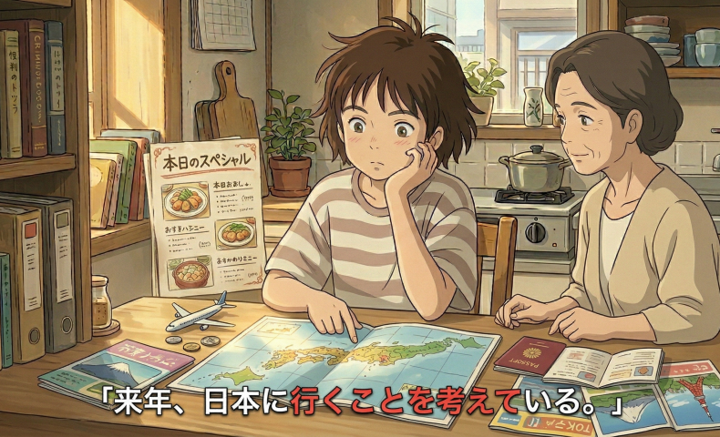 (8) 来年、日本に行くことを考えている / 考えています。