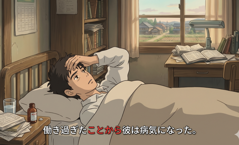(1)働き過ぎたことから彼は病気になった / 病気になりました。