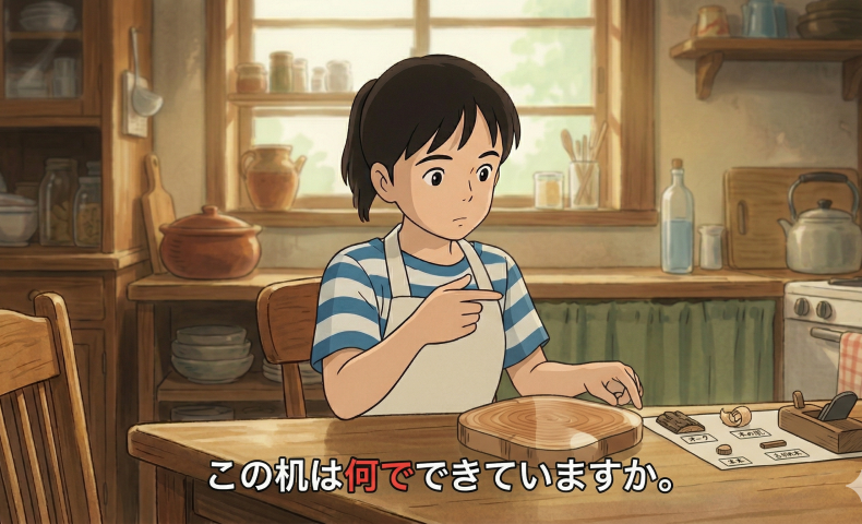 (4) Kono tsukue wa nan de dekite imasu ka. Ki de dekite imasu.