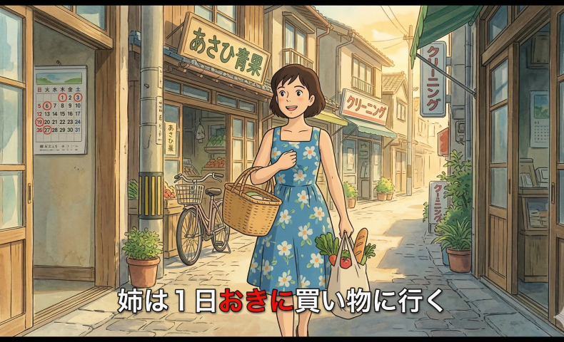 (2) あねはいちにちおきにかいものにいく / いきます。