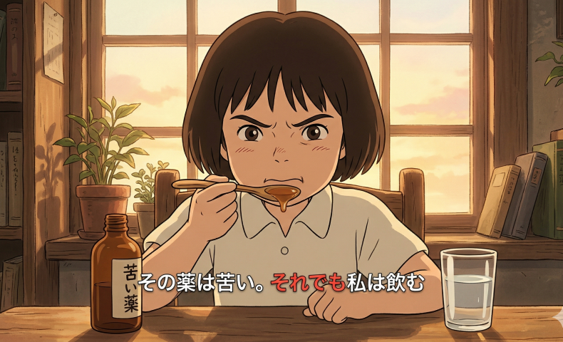 (1) そのくすりはにがい。それでもわたしはのむ / のみます。
