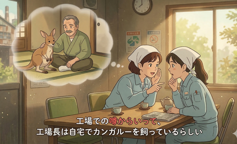 (6) こうじょうでの うわさ からいって、こうじょうちょうは じたくで カンガルーを かっているらしい / かっているらしいです。