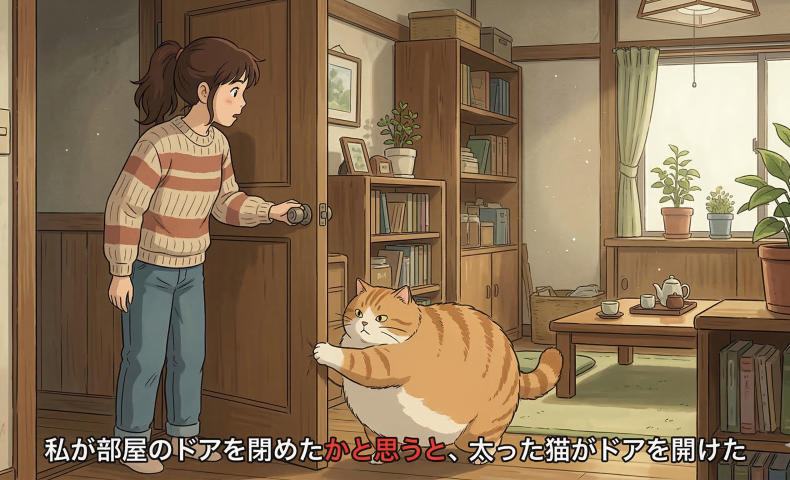 (4) わたしがへやのどあをしめたかとおもうと、ふとったねこがどあをあけた / あけました。