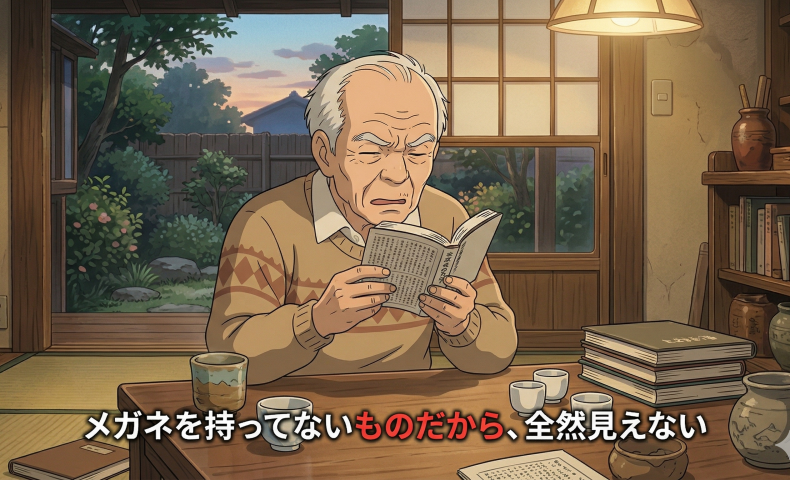 (3) メガネを もってない ものだから、ぜんぜん みえない / みえません。