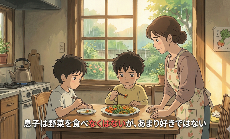 (4) 息子は野菜を食べなくはないが、あまり好きではない / 好きではありません。