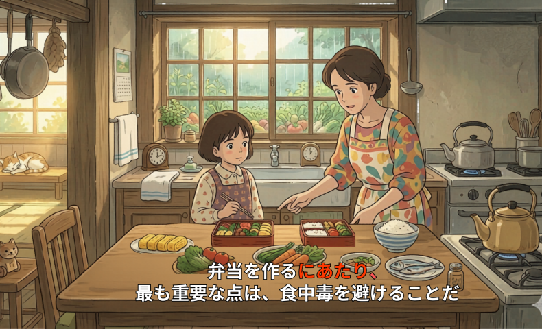 (6 ) Bentō o tsukuru ni atari, mottomo jūyōna ten wa, shokuchūdoku o yokeru kotoda/ yokeru kotodesu.
