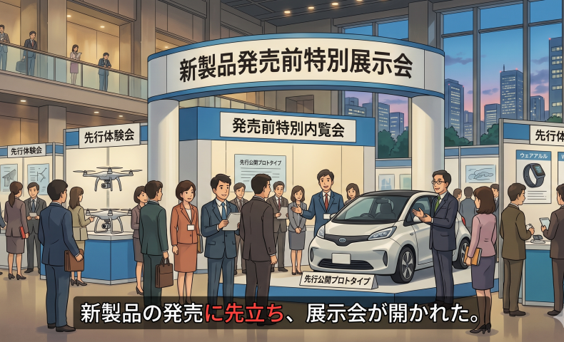 (3) しんせいひんの はつばい にさきだち、てんじかいが ひらかれた / ひらかれました。