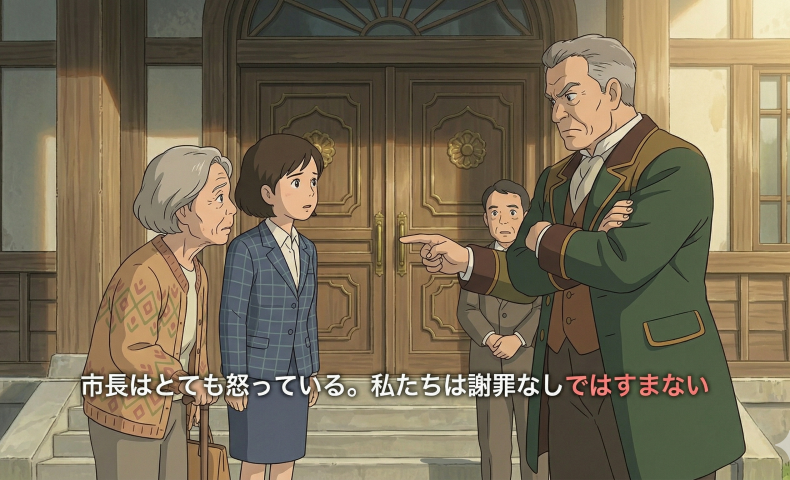 (3)市長はとても怒っている。私たちは謝罪なしではすまない / すまされません。